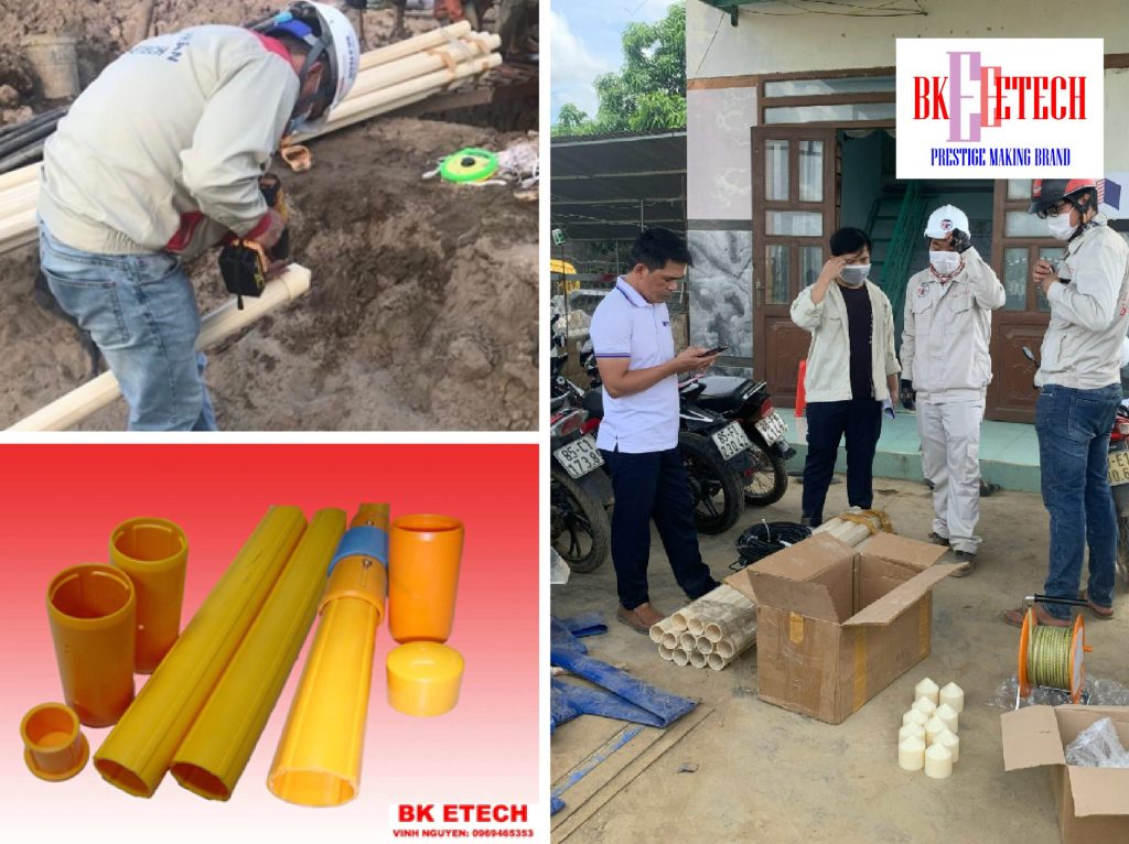 - Đưa lần lượt từng ống đã được lắp trước một đầu ống nối xuống lỗ khoan, giữ một đầu ống bằng kìm dây.