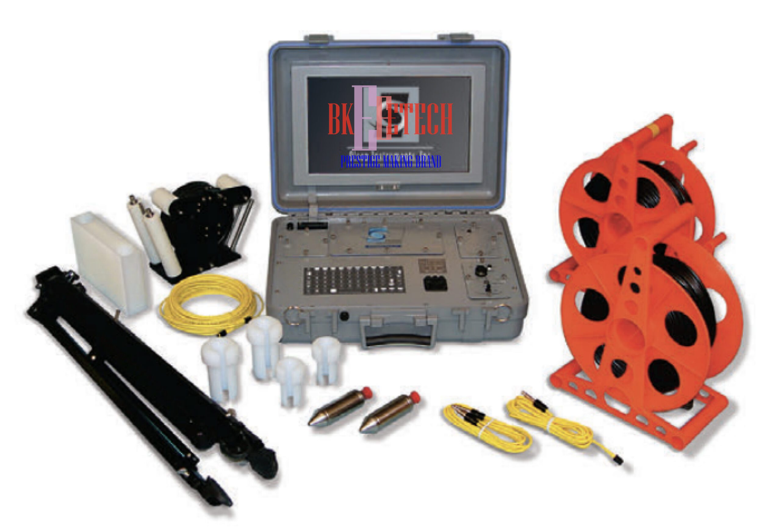- Bộ đo độ sâu sử dụng bánh xe gắn trên giá ba chân có thể điều chỉnh độ cao, nối với máy tính chuyên dụng bằng cáp dài 15m.