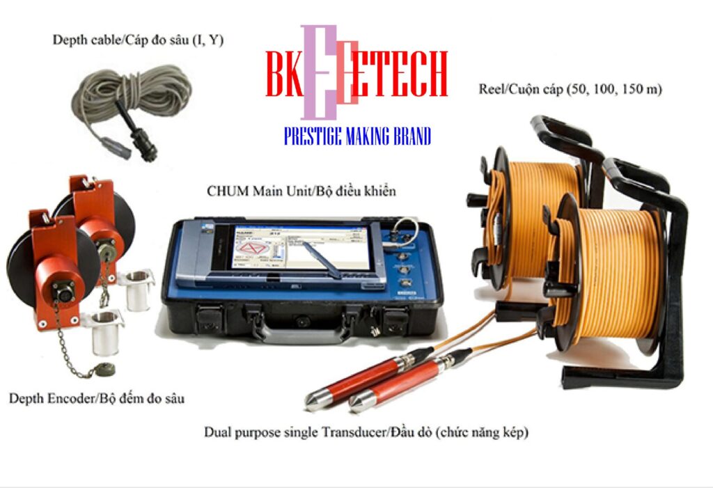 - Thiết bị siêu âm cọc khoan nhồi CHUM (Cross Hole Ultrasonic Monitor): Sử dụng phương pháp Crosshole Sonic Logging (CSL) để thực hiện việc kiểm tra chất lượng thi công cọc khoan nhồi. Hệ thống sử dụng sóng siêu âm được gửi đi từ đầu dò phát tới đầu thu nhận thông qua môi trường ống có đầy nước được nhúng vào trong lòng bê tông.